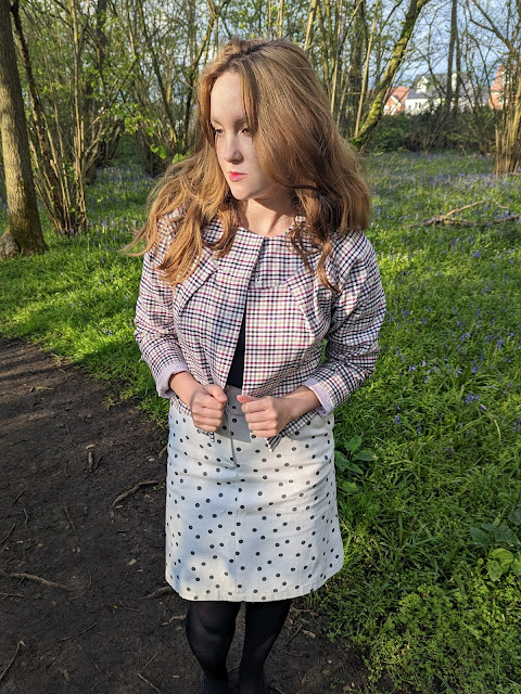 I had 2.5 metres of this cream with black polkadot Rico cotton canvas I purchased originally to make a jacket, but I am in need of more skirts due to a wardrobe/attic cull or fabric recycle. I really like this one too, it's understated and an airy colour, and the perfect skirt weight without needing a lining. McCalls 6361 is trousers or a straight skirt with a fly zip. The pattern is one of those fitting practice Palmer Pletsch patterns, I basted the side seams at 1 inch and ended up seeing them down at 1 inch as I was happy with the fit, the seams are marked 1.5cm in the instructions but it has you put on the skirt inside out and pin it to size. There is a photo step missing for sewing the fly (sewing it near the zip before doing the topstitching from the outer side), but I have sew fly zips before so knew how to make it. I sewed a straight 14 (38 hip) I think my hip is 39 high high 40 lower hip / thigh but a 14 has always fine for skirts. I sewed two trousers hooks for the closure, in gunmetal. You could use a button of course, I was considering using a black button to complement the polkadots. I sewed the pocket linings and waistband in a soft cotton volie from when Sea Salt sold fabric. Jacket fabric supplied by Minerva in 2021 for review.