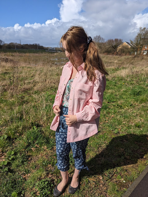 Deer and Doe Fougere Overshirt made with ramie linen in baby pink gifted for review by Minerva. I sewed it with metal stud 12.5 cm buttons in gold. My changes to the pattern were to interface both sides of the collar, collar stand and cuffs, and then add interfacing to the top part of the pockets, more for wear and tear because this fabric doesn't droop. I'm not a fan of fabric that is too drapey, this one is similar to cottons and linen types, maybe even denim, my favourites. Ramie linen is made from nettles, I think a plant base must be like viscose but it isn't drapey, I recently purchased 6 metres of 'viscose linen' from another store not realising there was no linen, the drape was stretchy and no shape to it after one prewash at 30 degrees and it was unravelling at the edges, so I had to donate! I know from previous purchases I didn't like viscose twill (or challis), I was hoping it would be similar to these ramie 'linens' instead.
